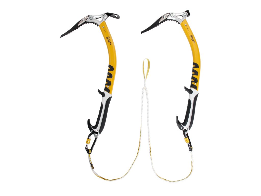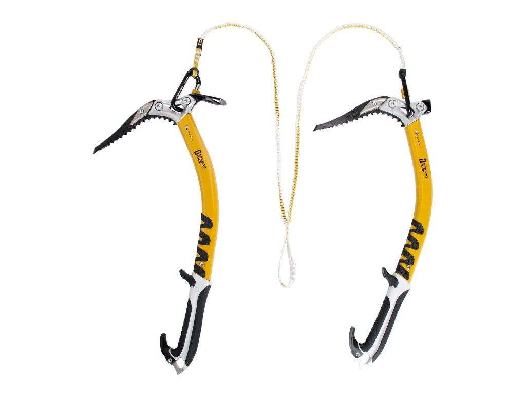 - karabiny mohou být připojeny k hlavě nebo dolnímu hrotu cepínu